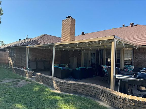 Charming 1961 sf home featuring an open-concept design. The large living room seamlessly connects with the expansive kitchen and dining area, offering a pantry and a dedicated laundry room with a walk-in closet for extra storage. With 3 bedrooms, 2 bathrooms, and a 2-car garage that includes a storm shelter built for 15 people, this home provides practical and comfortable living. A carport offers additional parking, and the large outdoor patio is ideal for entertaining, while the kids' playhouse and two outbuildings add to the home’s appeal.