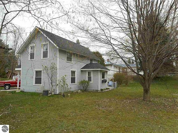 Attractive 1 1/2 story in Beulah but not right downtown; VILLAGE LIVING AT ITS BEST, CLOSE TO EVERYTHING AND YET near "a small wood" to add to a private feeling yard. Both small deck and dining room overlook private yard with trees bordering the property for privacy. 1990s - new windows, doors, vinyl siding and dining room addition; new furnace, 7 years ago. New roof in 2014 and front porch redone. Central air, all bedrooms upstairs, full basement under 2 story part with laundry. Workshop next to garage is 12 x 16; downstairs den/study is "other room" 10'7 x 14'5".