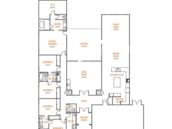 The Sunflower: The Sunflower combines comfort and design with 3,660 square feet, 5 bedrooms, and 3.5 bathrooms all in a single-story layout. The open kitchen features granite countertops, apron sink, pot filler, and upgraded lighting. A private full bath in one of the secondary bedrooms makes guest stay easy, while the primary suite includes a spacious bath and walk-in closet. A 3-car garage is included.