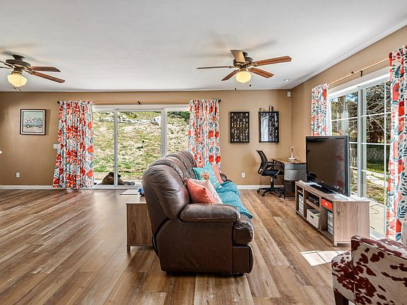Awesome View Home in Lake Elizabeth - Step up to the open floor plan right into the living room with vaulted tongue & groove ceilings, stone hearth w/pellet stove and adjacent to both the kitchen & family room. The updated kitchen has quartz counter tops, newer cabinets, 5 burner gas range, built-in microwave, dishwasher and refrigerator. The family room is spacious with room for a pool table & lots of seating. The laundry closet is located in the family room & can hold a stack washer/dryer or side by side units along with additional storage. There are 4 bedrooms, the large primary bedroom has a sitting area along with a balcony with views of the mountains & lake. The primary bathroom has a jetted tub w/shower, tiled surround, tile floors and a nice vanity. One of the guest bedrooms also has a balcony over looking the backyard. The main floor bathroom has been updated with a tiled shower, laminate floors & spacious vanity. The garage has been converted into an office, storage & more