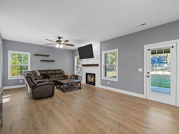 Open-concept layout featuring luxury vinyl plank floors, a shiplap fireplace centerpiece, and an abundance of natural light. The kitchen is a true showstopper with granite countertops, stainless steel appliances, tile backsplash, a pantry, and soft-close cabinets and drawers.