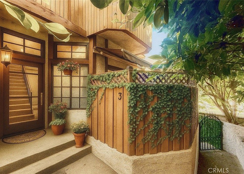 Former Celebrity owned and a rare find in the heart of Studio City: a sophisticated & upgraded tri-level townhome with a private rooftop penthouse oasis. Tucked away on the quiet, tree-lined Bloomfield Street, with a private gated entrance and a serene walkway & garden this hidden gem shares ground with only four townhouse units. This immaculate, move-in-ready home, is designed to impress. This unique “turn-key” sanctuary features comprehensive smart home automation, including automated sensor lighting, a Ring doorbell, Nest thermostat, and Lutron lighting. Upgrades like fresh paint, new carpeting, new flush ceiling lights, and beautiful crown molding are found throughout. With upgraded electrical and plumbing, plus a newer, economical HVAC system, this home ensures comfort and low utility costs. The home includes a rare low HOA fee of $300, which uniquely includes gardening, water, trash, exterior lighting, and building insurance. Step inside to a spacious, light-filled living area with soaring ceilings, a cozy wood-burning/gas fireplace, and an inviting large bay window with wide seating — the perfect spot for reading or relaxing with your canine companion. The formal dining area flows seamlessly into a beautifully remodeled kitchen featuring elegant cherry wood cabinetry, gleaming granite countertops, stainless steel appliances, under cabinet lighting and a built-in ceiling sprinkler system for safety. The expansive primary master bedroom suite boasts dramatic 12-foot ceilings, a spacious walk-in closet, a custom vanity, a large tub/shower combo, and its own private shaded balcony under the trees. A second bedroom also features its own private en-suite bath. The home's pet-friendly, no-maintenance backyard features artificial turf and a convenient pet door for easy, private and safe access. The crown jewel of this home is the private rooftop penthouse and terrace. Ascend a sunlit staircase—illuminated by a stunning skylight and adorned with a one-of-a-kind mural painted by the home’s owner, an accomplished filmmaker. Discover a fully enclosed sunroom with its own heating, AC, and a solar fan—ideal for a bright home office, yoga studio, or entertainment lounge in the sky. This spectacular retreat offers panoramic 360-degree views of Studio City from an expansive deck with intricate stamped concrete. Also included is a 15' x 8' storage space. Located within walking distance of The Shops at Sportsman's Lodge, Harvard Westlake, and the major studios.