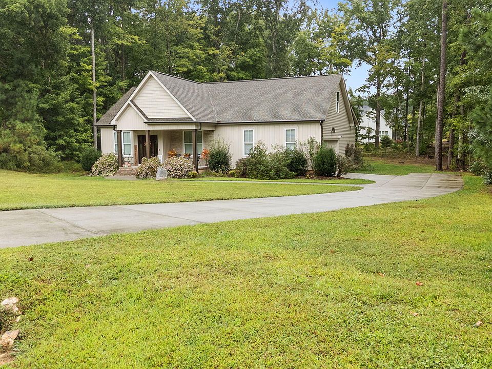 Step into timeless elegance with this custom-built ranch by Steven Hayes Builder Inc., where thoughtful design and refined finishes come together to create a home of unmatched sophistication. This one-level residence offers a seamless open floor plan that lives spaciously yet feels warm and inviting, ideal for both entertaining and everyday living. The primary suite is a private retreat, featuring an expansive walk-in closet, dual vanities, an oversized spa-inspired shower, and a private water closet. A well-designed split-bedroom layout ensures comfort and privacy, while the thoughtfully connected laundry room provides ease of living. At the heart of the home, the chef's kitchen delights with striking granite countertops, a grand center island with seating, custom cabinetry, and premium stainless steel appliances, all illuminated by designer lighting. The kitchen flows effortlessly into the family room and dining area, where elegant trim details and a shiplap accent wall elevate the aesthetic. Every detail has been carefully considered, from the wood and LVP flooring that grace the main living areas to the custom front entry that sets a striking first impression. An unfinished walk-up space offers endless possibilities for a theater, fitness studio, or recreation room—an opportunity to tailor the home to your lifestyle. Outdoors, the covered front porch welcomes guests in style, while the rear porch provides a serene setting to overlook the private, wooded 0.92-acre cul-de-sac lot. An oversized two-car side-entry garage further enhances both functionality and curb appeal.