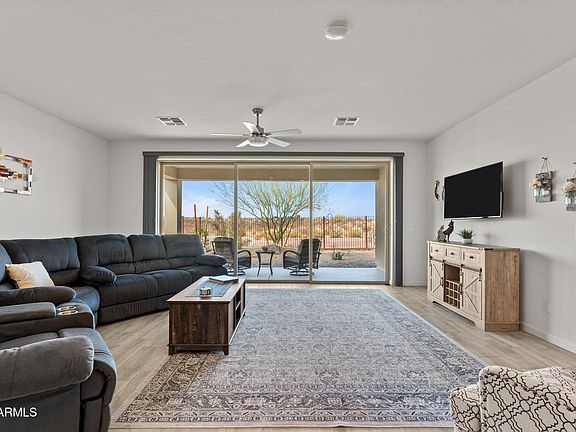 Located in the sought-after resort-style community of Wickenburg Ranch, this stunning home epitomizes modern desert living with its thoughtful design and luxurious features. The open floor plan seamlessly integrates indoor and outdoor spaces, highlighted by a large wall of sliding glass doors that lead to a covered patio with breathtaking desert views—perfect for relaxing or entertaining. The sleek, upgraded kitchen serves as the heart of the home, boasting contemporary finishes, high-end appliances, and an oversized island for gathering and meal preparation. Abundant natural light flows throughout the home, creating a bright and airy ambiance.