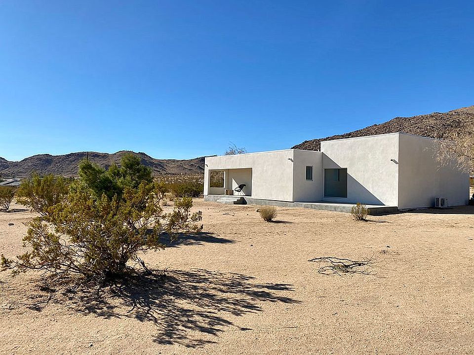 Near the western entrance to Joshua Tree National Park sits this newly renovated modern ranch on 2.5 acres of Mojave Desert and surrounded by mountain views of the park. Designed by an architect, the home includes three bedrooms, two bathrooms, and an open kitchen/ dining/ living room with expansive desert views. This modern home features a master bedroom with en suite bath and private entrance, two guest bedrooms with an indoor-outdoor bathroom and 2-person Duravit soaking tub, aluminum sliding glass pocket doors, a gourmet kitchen with custom cabientry and stainless Bertazzoni appliances, luxurious bathrooms with Turkish plaster, Duravit fixtures and soaking tub; Grohe fixtures, a wood deck, multiple patios, an outdoor fire pit, and a mountain backdrop with mature native landscaping.