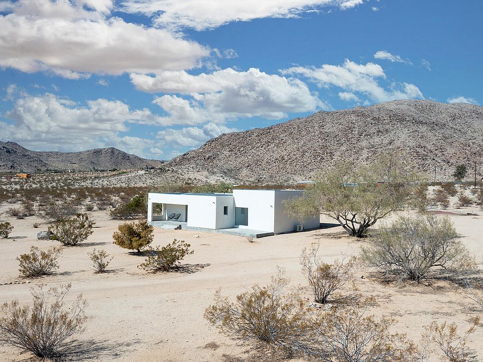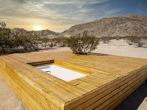 Prepare to pack your bags for this minimalist luxury escape on 2.5 panoramic acres in Joshua Tree! Exquisitely reimagined by the architect/ owner in a desert-luxe style, this 3 bedroom, 2 bath turnkey daydream in the Hi-Desert will take your breath away. Enjoy this premier location with pristine desert landscape and forever views of the Bartlett and Joshua Tree National Park mountains. Gorgeous, retracting sliding glass doors open up the house for indoor and outdoor living, ideal for taking in the desert vibes and entertaining friends on the stargazing deck with built-in Duravit Starck soaking tub or dining alfresco on the covered front porch. Featuring luxe architectural details including aluminum doors and windows, fine stucco facade, chic concrete floors, gourmet kitchen with custom cabinetry, large island and stainless Bertazzoni appliances, beautiful Turkish plastered bathrooms with Duravit fixtures and Grohe faucets, indoor-outdoor center bathroom with retractable motorized shade, and designer upgrades throughout. Just minutes from the village cafes and boutiques, and the Joshua Tree National Park main gate, its the perfect primary, second home, or investment property. This stunning retreat is the special one you've been waiting for. Welcome to your luxury desert dream come true!