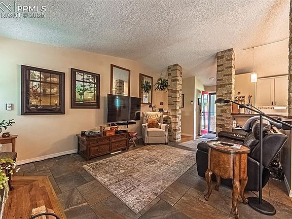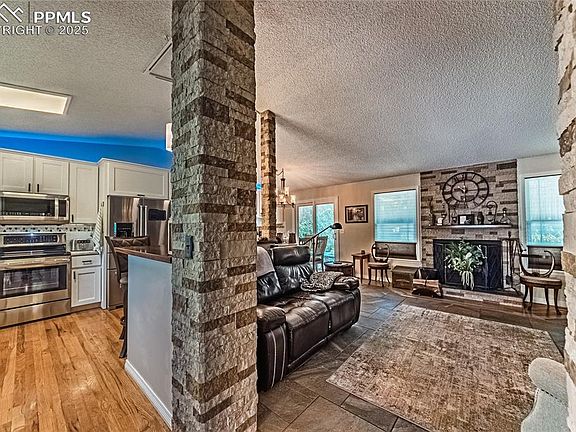 Beautifully Updated Home! Welcome home to this stunning 5-bedroom, 3-bath ranch-style property offering the perfect blend of comfort, space, and style. Thoughtfully updated throughout, this home features modern upgrades paired with timeless touches that create warmth and functionality at every turn. Inside, you’ll find a spacious floor plan with custom cabinetry in the kitchen, dining room, and laundry/utility room. Stone-wrapped columns and a stone-clad fireplace anchor the living spaces, while stone-look tile flooring on cement board adds both beauty and durability. The main-level primary bedroom features rich hardwood flooring, cedar-lined closets, and solid core doors for added privacy and comfort. Each of the bathrooms has been fully renovated, featuring semi-custom cabinetry, marble flooring, and tile shower enclosures with cement board backers, all built with soundproofing insulation for a serene experience. Window blinds are Select Blinds, Premier TriShades line, cordless manual honeycomb double cell shades with a sheer top. Blackout in the two upstairs secondary bedrooms, and light filtering everywhere else. Primary bedroom features motorized shade with remote control. All cabinets and drawers in the kitchen, dining room, and upstairs bathrooms are soft close. Enjoy cozy nights in your very own theater-style room. The Renewal by Andersen windows on the main level add energy efficiency and natural light. The oversized 2-car garage offers Poly-Aspartic floor coating along with custom cabinets and workbench, plus an additional covered carport. Don't overlook additional features like Polycarbonate window well covers and an ActivTek Environmental Air Scrubber Plus system which add the finishing touches for a home designed with wellness and longevity in mind. Located just minutes from shopping, schools, hospitals, parks, the Powers Corridor, and Fort Carson. This home truly has it all. Move-in ready, beautifully maintained, and packed with upgrades. Welcome Home!
