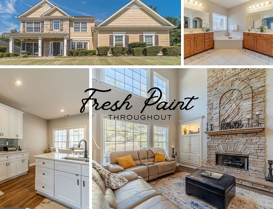 Master on the main in beautiful Woodlake neighborhood with 2,802 square feet of space to spread out! Beautiful, fresh paint throughout the home. This charming home offers a spacious master suite on the main level, complete with dual vanities, a relaxing soaker tub, and deep walk-in closets. The kitchen is a showstopper, featuring a double oven, gas range, elegant light granite countertops, fresh white cabinetry, and a sunny eat-in area. Perfectly designed for today's lifestyle, the kitchen opens seamlessly to the living room. The heart of the home is the soaring two-story great room, where a dramatic stone fireplace stretches all the way to the ceiling-an ideal space for both cozy evenings and lively gatherings. Upstairs, you'll find four generously sized bedrooms, thoughtfully arranged to provide comfort and flexibility for family, guests, or a home office. Outside there is a lovely screened in porch for relaxing and looking at nature, and an outdoor shed for more storage. Roof and water heater are approximately 8 years old. The Woodlake neighborhood features a swimming pool, tennis/pickle ball courts, 2 playgrounds. In the mood for golf? There is a optional golf course membership within the neighborhood that you'll want to check out too!