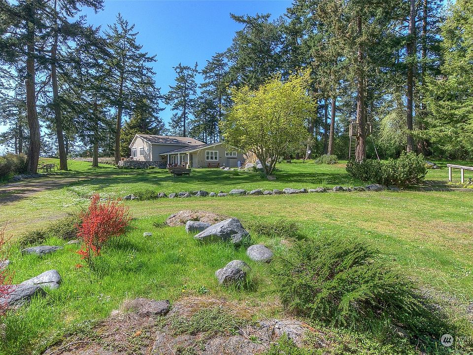 Located near beautiful Eagle Cove Beach and American Camp, this charming 2 bedroom, 2 bath home offers privacy in a spectacular setting. Over 2 acres of sunny, landscaped & level acreage with a peaceful water view knoll near the house. Split level floorpan w/living room and kitchen on main floor. Light-filled sitting room & office space adjacent to the bedrooms offers a peek of blue water. Features: Covered porch, skylights, large pantry w/prep sink, extra refrigerator, storage & counter space. Fenced garden with raised beds ready to be planted! Carport, garden shed, shop etc. offer abundant storage space. Eagle Cove water membership plus excellent irrigation well, incl. storage tanks. 3 bedroom septic, easy access to Eagle Cove Beach.