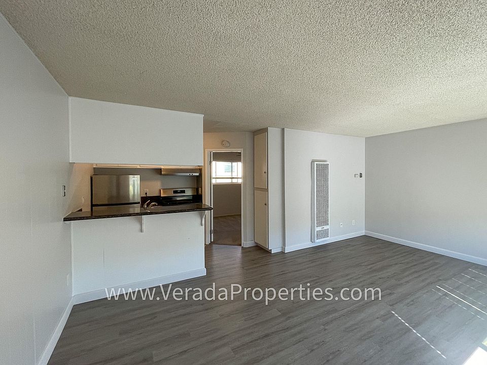 Excellent upstairs 1bedroom apt in 17 unit gated courtyard building. This apartment has new wood laminate flooring and a carpeted bedroom, large bathroom, open kitchen with bar top to living room, new windows and 2 large linen closets. Stainless refrigerator, gas stove, very nice shared laundry room with 2 washers and 2 dryers, and partially covered parking. Available for immediate move in! Minimum 650 credit score per applicant, and a combined gross monthly income of 2.5x the base rent + a good rental reference in the past 2 years.