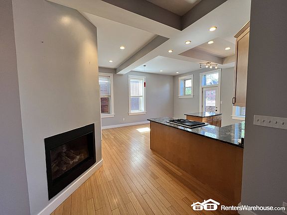 Electric fireplaceOpen planLarge closetStone countertopsStainless steel appliancesSeparate tubGas grill