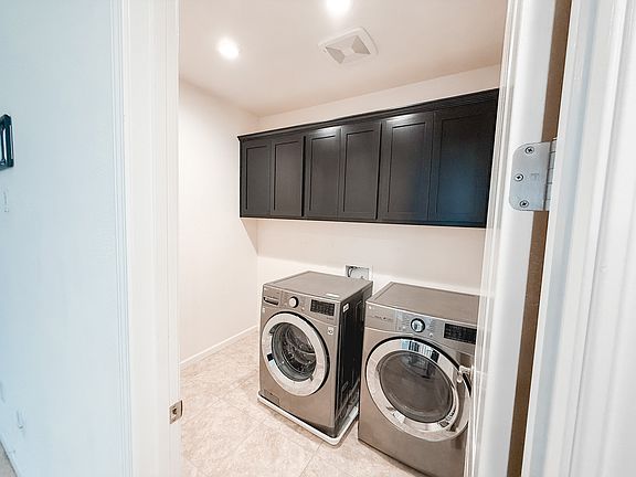 Convenient Laundry: A spacious upstairs laundry room with cabinetry and tile flooring makes laundry day a breeze.