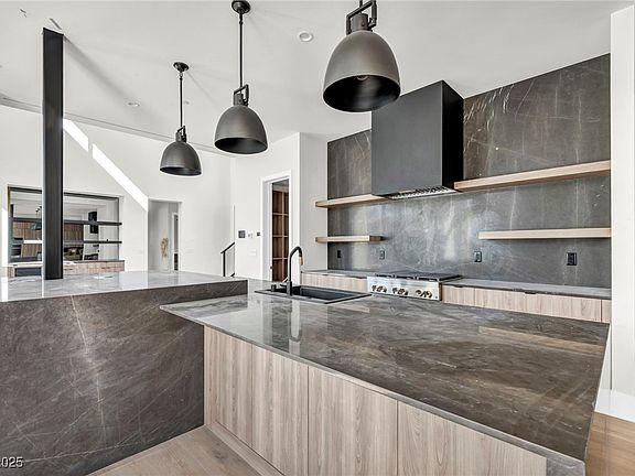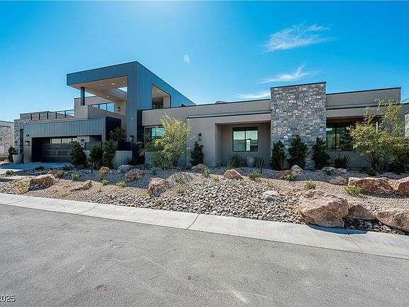 Floor-to-ceiling windows fill the space with natural light and frame stunning views of Lone Mountain. This home features a heated pool and spa, a fully landscaped lot, a private entry courtyard, an outdoor shower, minimal HOA restrictions, Control4 smart home technology, and an integrated sound and security system—offering a seamless blend of sophistication and comfort