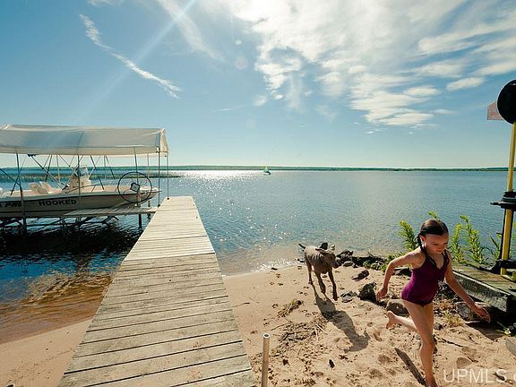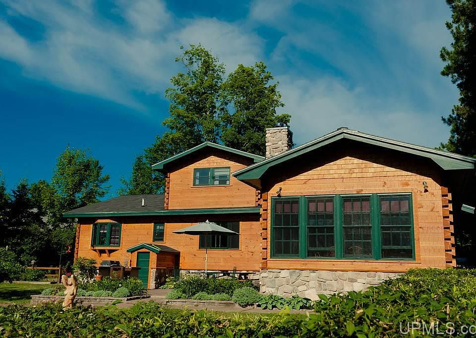 Truly a four season home, this 3 bedroom 4 bath home has space for family, and gatherings of all sizes, indoors and out! The exterior is exquisitely maintained and cared for featuring outdoor living on the lake at it's finest. 100 feet of shallow sandy shoreline for swimming, boating, fishing, add to the splendor of this home. The home has a rich, stately feel when you walk in the formal foyer. The dining room/living room features a beautiful fireplace on one end. Just off the living room is a beautiful and functional office/den and a multi purpose family room that is it's own space from the main house, perfect for movie and game nights! The master suite encompasses the entire side of the home with a master bath featuring a steam shower. The walk in/walk through closet and linen closet separates the two bedroom/dressing room spaces. The upstairs bedrooms are spacious with a newly renovated private bath between them. There's a main floor laundry and sauna plus another full bath with jetted tub for a enjoyable soak. The huge kitchen with a tremendous view of the lake, it's own wood burning fireplace is a perfect gathering place.... step out of the kitchen and you're on the spacious patio graced by an amazing outdoor kitchen. The detached 2 car garage has a workshop plus a bunkhouse upstairs. Although mainly unfinished, utilities are available in this space. The biking/walking trail that connects Houghton and Chassell is accessed just across Lindala Road and does not go in front of the home along the lakeshore. This home has everything for you and your family to live in and enjoy year around!