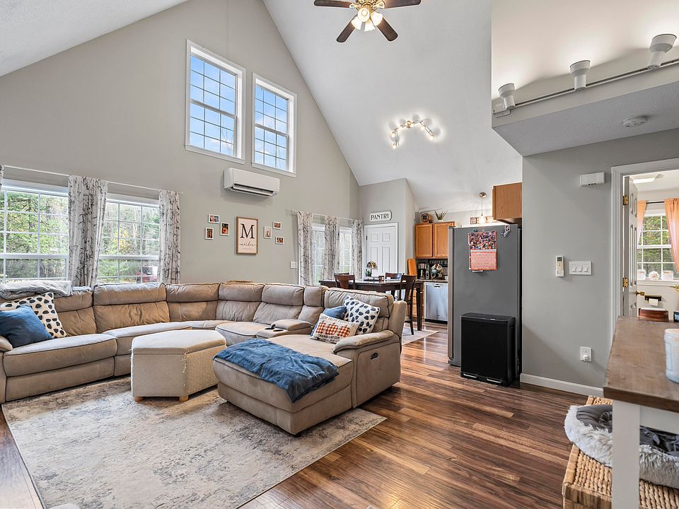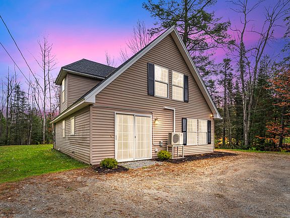 Beautiful 3-bedroom, 2-full bathroom chalet nestled on 2 private, wooded acres offering peace and tranquility while still being conveniently close to town. Step inside to an inviting open-concept layout featuring soaring cathedral ceilings and large windows that fill the space with natural light. The spacious living area flows seamlessly into the kitchen and dining spaces, perfect for gatherings or cozy nights.