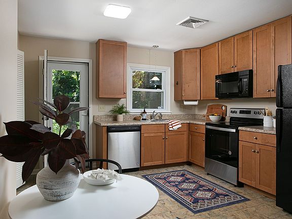 Off the kitchen is a back door that leads to your private rear patio. Enjoy a peaceful view of the surrounding woods and a shared backyard with bonfire pit.