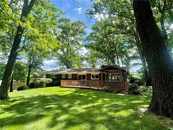 Beautiful solid brick ranch home located in the desirable Timberly Heights Plan. A stunning stone fireplace takes center stage in both the spacious sunken living room as well as the updated kitchen! Built-in wall oven and cabinetry in the stonework, solid wood cabinets and granite countertops top off this lovely kitchen, with sliding doors to back deck with gazebo. Wood-look ceramic tile spans from entryway into kitchen for a cohesive and modern look. A large dining room is located just off of the kitchen and living room. Three spacious bedrooms, all with walk-in closets and the primary bedroom includes a full bathroom. Downstairs you will find an inviting family room with large stone fireplace as the highlight. Laundry and extra storage in the unfinished portion on the basement. Oversized 2 stall garage with man door to the blacktop driveway. Enjoy neighborhood walks, activities in the shaded backyard and picnics on the back deck!