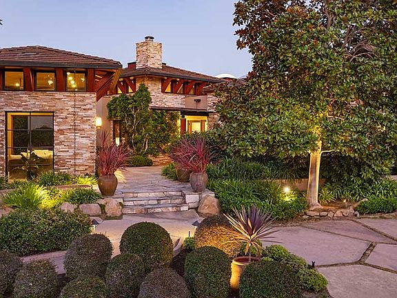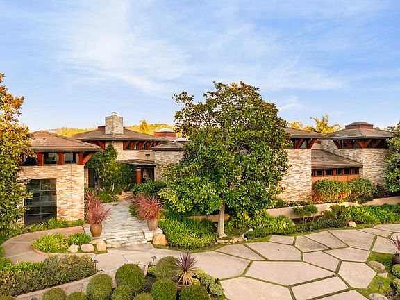 Situated on the 18th fairway of the Birnam Wood Golf Club, this fine home is one of famous architect Barry Berkus' final masterpieces. The home offers a seamless blend of indoor and outdoor beauty with lush and always blooming landscaping, a large Koi pond, and expansive sliding glass windows which highlight the spectacular mountain view. The home combines elegance with functionality, offering plenty of walls for art with each room thoughtfully designed to maximize space, natural light, and privacy. Two ensuite guest bedrooms are located down a private hall with sliding doors opening out to a courtyard and koi pond. The kitchen fireplace adds a cozy touch, making it ideal for intimate gatherings or a wonderful spot to enjoy your morning coffee. A fourth fireplace in the den provides... a comfortable place to play games, read a book, or watch a favorite movie. A rear patio, with wide open views of the mountains, offers the perfect backdrop for informal meals, relaxation or socializing in a stylish atmosphere. The detached outdoor entertainment pavilion with a fireplace and wet bar adds to the property's allure, offering a gorgeous spot for gatherings and sitting from morning to evening. The oversized three-car garage and deluxe laundry room are practical features, thoughtfully designed with extra amenities like a half bath, an additional refrigerator, and plenty of storage throughout. The exquisite use of wood and stone flooring throughout the home, coupled with a custom stone exterior, enhances the natural, luxurious aesthetic. And best of all, living in a Barry Berkus designed home is a special experience that connects you to architectural history.