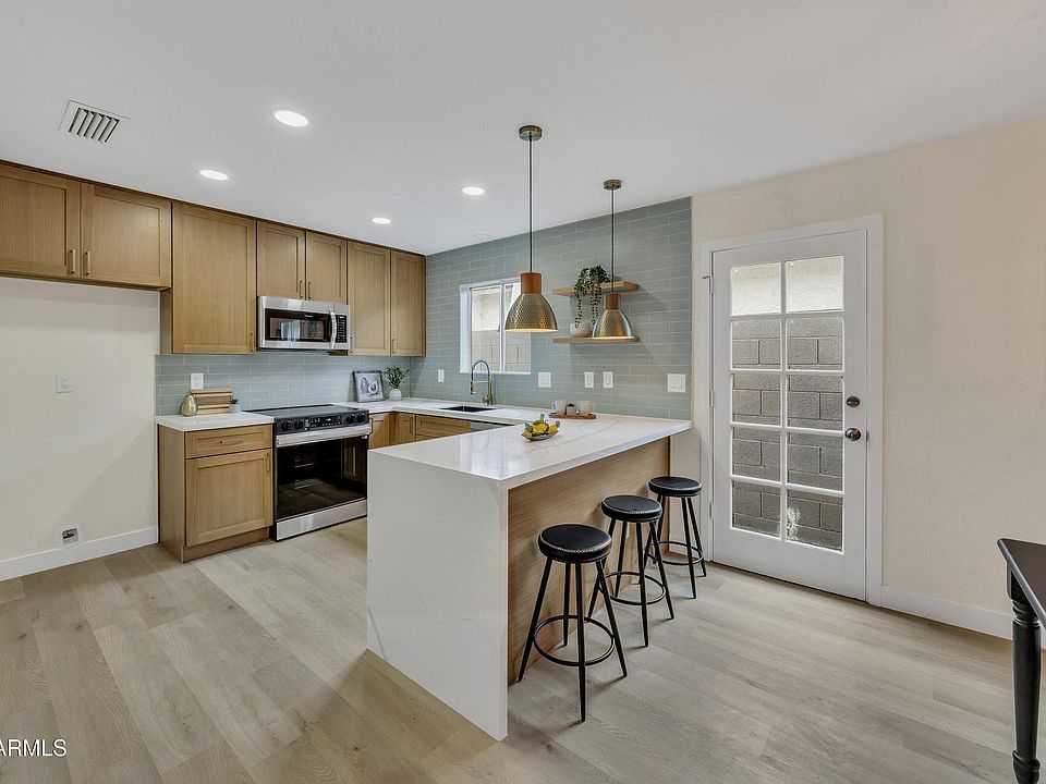 Welcome to your dream home in the highly sought-after Mesa Patios Subdivision located in the heart of Mesa. This gem has 2 large bedrooms, 2 bathrooms, and a 2 car carport, offering plenty of room. Discover a true no expenses spared fully renovated designer grade interior with NEW white oak cabinets, NEW flooring, NEW tiled shower, NEW quartz countertops, NEW appliances, NEWER Roof and HVAC, and much more! As you step through the front door, you'll be greeted by the expansive open floor plan, complemented by a beautiful kitchen creating an inviting atmosphere. Step outside to a covered patio, perfecting for entertaining loved ones. Don't miss the opportunity to make this delightful turn key home yours, nestled within a highly-desirable subdivision in Mesa; NO HOA and close to everything!