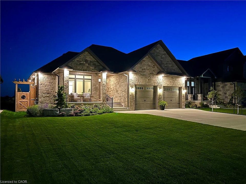 Welcome home to this ‘Must See’ one-of-a-kind custom built Executive Bungalow, expertly crafted by the esteemed Bryan Snyder and team from Snyder Development. Encased in a stunning stone exterior, this 1,609 ft² home exudes quality with carefully selected finishes throughout. There were no upgrades overlooked here! Step inside to an inviting, well-designed layout featuring warm maple hardwood floors, luxurious quartz countertops, premium faucets, fixtures, and lighting. The dreamy gourmet kitchen flows into a stylish wet bar and serving area, while a hand-crafted fireplace mantel anchors the cozy living space with timeless charm. Outside, the southwest-facing backyard offers breathtaking sunsets from a raised walk-out patio, set against lush, golf-course-quality lawns sustained by a private Sandpoint well with unlimited free water. The professionally landscaped grounds, feature imported stone, a variety of pine trees, vibrant flowers, and lush plants. The spacious lot is 60 x 131 ft, and the fully fenced yard includes two private gates, a gas BBQ hookup, and dedicated outlets for a wood-fired smoker. A full concrete driveway, sidewalk, and backyard patios are established too. Upgraded soffits and a complete exterior lighting package highlight the charm of the front and rear covered porches, making this home shine day or night. The two-car garage has been boosted extra wide, and extra deep by design, providing ample room for vehicles and storage – and even equipped with an EV charging rough-in. The basement is framed and roughed-in for bedrooms 4 and 5, a large recreation room, a 3rd bathroom, and a 2nd wet bar, offering endless potential. The utility room is well organized too, housing a wall-mounted tankless water heater (owned). Located just 20km from Bruce Power and steps from the beach, lake, trails, and parks, this turnkey home lets you skip the multi-year building process. The only thing left to do is move in and enjoy. Welcome Home!