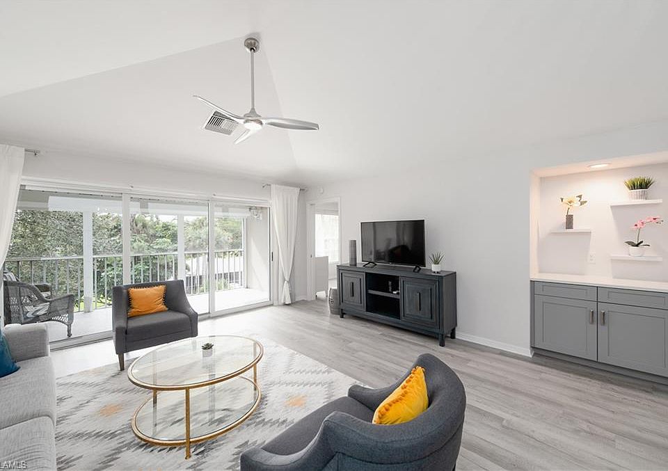 Exceptional Seller Financing Available — offering a competitive rate and low down payment. This fully renovated, turnkey 3rd-floor condo in The Pines sits well above the flood zone and has remained unaffected by recent storms, including Ian. No flood insurance is required, and the well-managed HOA has had no assessments in the past four years with strong reserves. Located in the desirable northwest corner of Pine Ridge, this residence is just a short walk to Mercato, Whole Foods, the Ritz-Carlton, and Vanderbilt Beach. The Pines is one of North Naples’ best locations, combining quiet privacy with unbeatable convenience. Inside, the home has been completely transformed with high-end finishes, a neutral coastal palette, upgraded lighting and outlets, and a Waterdrop RO system. Both bathrooms feature custom vanities, frameless showers, porcelain tile, and thoughtful design details. The chic furniture package is included, offering a true move-in-ready experience. Enjoy the private screened lanai with new tile flooring and peaceful views of mature trees and lush landscaping. This condo is sold turnkey, down to the décor and bedding—just bring your toothbrush. No renovation stress, no surprises.