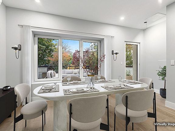 Enter through the parlor level of this classic brownstone into expansive living and dining areas that bookend an impeccably designed chef's kitchen with Bosch stainless steel appliances, custom cabinetry, and an impressive 14 foot island which can seat up to 6. A powder room is conveniently located in the rear of the home as you exit to a private terrace and generous backyard with nearly 800 square feet of glorious outdoor space. The ground level features a large primary suite with floor to ceiling windows overlooking the serene backyard and a large walk-in closet and en suite bathroom with double vanities and walk-in shower with dual shower heads. Two secondary bedrooms share another well-appointed full bathroom with bathtub, while the hallway provides plenty of room for a home office area. The cellar level is finished with a massive recreation room, another half bathroom, a utility and laundry room, and excellent storage.