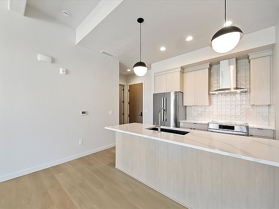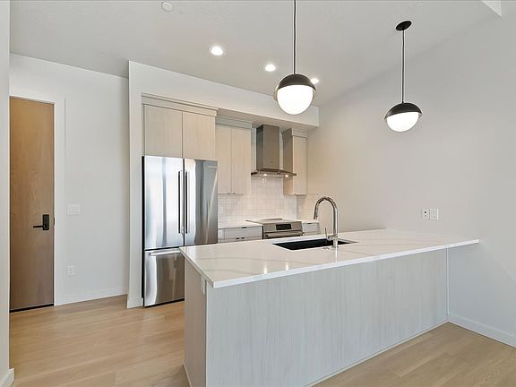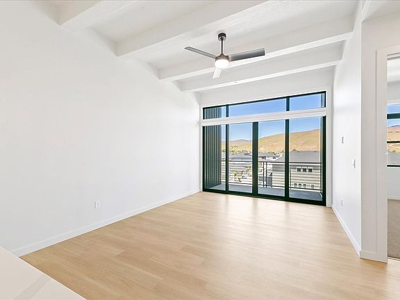Pets are allowed at this brand new condo is located in the historic Barber Valley of NE Boise's Harris Ranch. There is even a pet washing station for your furry friend! Nestled off Warm Springs Avenue and Parkcenter Blvd, between the Boise River and Foothills, Stacker Lofts blend urban convenience with natural beauty, prioritizing more playtime and less home upkeep. Loft 304, on the top floor, boasts stunning foothill views, inspiring adventures like hiking and biking, with a private balcony to soak it all in. Inside, enjoy lofty beamed ceilings, abundant windows, and premium finishes like tile, quartz, custom glass, and Bosch appliances, including refrigerator and washer/dryer for effortless move-in. Fiberglass windows with 5% e-shade coverings balance privacy, light, and views. The great room features a flat-screen-ready panel and 12' wood sliding glass doors for seamless indoor-outdoor living. Residents enjoy a rooftop deck, clubhouse, private parking, bike storage, pet spa, elevator, secure lobby, and pool.