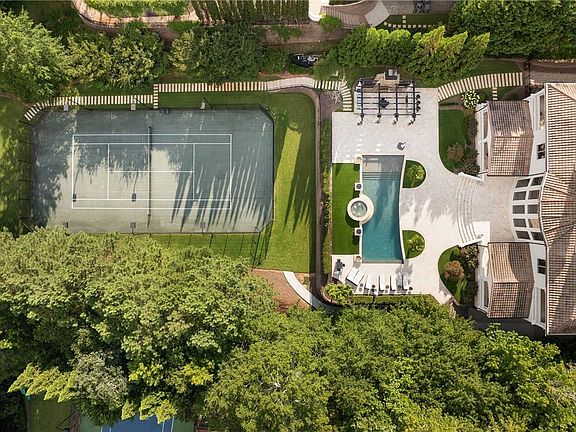 A masterwork of scale, sophistication, and setting, this privately gated estate redefines modern luxury living. Conceived for those with a global sensibility and a collector’s eye, the property spans over 16,000± square feet and rests on 2.2± impeccably manicured acres, offering a level of finish and amenity rarely seen in metro Atlanta. The current owners have reimagined every inch of the home to reflect an elevated, contemporary aesthetic, at once grand and intimate, timeless and current. Beyond the stately, double-height foyer, discover a formal fireside salon, a banquet-sized dining room and the striking champagne room: an artfully designed space punctuated by custom iron doors, a sculptural chandelier, a dry bar with dual wine refrigerators and a full bathroom, ideal for hosting or a retreat. At the heart of the home, the soaring great room captivates with a two-story window wall, architectural fireplace installation and a floating curved staircase that serves as both a design centerpiece and conversation starter. The chef’s kitchen is as functional as it is beautiful, flowing seamlessly into a keeping room, breakfast room and an adjoining scullery equipped as a full second catering kitchen. The main-level primary suite is a tour de force unto itself, featuring what may be the most impressive closets in private residential design. One is a bespoke, two-story couture gallery inspired by a Chanel boutique, created to showcase a world-class wardrobe. The other, reminiscent of a Tom Ford atelier, exudes sophisticated tailoring and sleek design. The upper level features six en suite bedrooms and two open-concept living lounges, ideal for hosting guests or accommodating a variety of lifestyle needs. The terrace level rivals any five-star resort with a glass-enclosed wine cellar and tasting room, a professional cinema, a state-of-the-art gym with a steam shower, an expansive recreation room with multiple entertaining zones and a fully self-contained guest apartment complete with a kitchenette. Outdoors, the estate unfolds into a world-class destination: a resort-caliber pool, illuminated tennis court and open-air kitchen pavilion with a fireplace invite year-round al fresco living. The four-car garage, with ceiling height engineered for car lifts, is a collector’s haven. Additional features include a three-stop elevator, barrel tile roof, designer lighting throughout, dual laundry rooms, and four covered verandas overlooking the private grounds. The property offers complete peace of mind with security systems, cameras and full perimeter gating. Ideally situated just outside the entrance of Atlanta Country Club, the estate enjoys a coveted location with effortless access to Sandy Springs, Buckhead, Truist Park and some of Atlanta’s finest natural amenities, including the Chattahoochee Nature Center and Sope Creek Trail. Moments from major interstates, yet cocooned in complete privacy, this is a rare opportunity to own a property of this scale, substance and proximity.