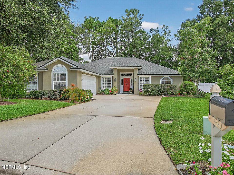 Located in the highly desirable Julington Creek Plantation, this beautifully maintained home sits on nearly a quarter-acre lot with a courtyard entry and oversized garage, and fully fenced backyard. Step inside to soaring 11-foot ceilings in the entry, dining, and living rooms, complemented by hardwood floors throughout the formal dining, formal living, and all bedrooms—no carpet anywhere. Versatile split floor plan combines open concept living with defined spaces. The kitchen features 42'' maple cabinets, stainless steel Maytag appliances, and overlooks the family room, where French doors open to a covered and screened lanai. Plantation shutters add charm in the dining room and front bedroom/office. The spacious primary suite boasts a tray ceiling, private lanai access, a large walk-in closet, and a spa-like bath with dual vanities, soaking tub, and walk-in shower. Roof (2018), HVAC (2024), Water heater (2024), Whole house water softener, Utility Sink, Irrigation System on Well.