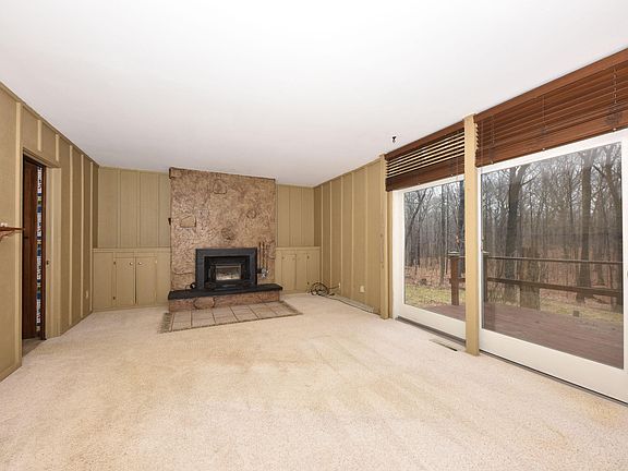 Back in the woods seclusion with fantastic views of rolling hills and beautifully wooded acreage! Enter this property up a long wooded driveway that crests on a ridge that this home sits atop. Large entryway opens to sunken living room and dining area with separate family room with fireplace and commanding views of nothing but trees. 3-4 bedrooms as the owners used one as a library...Bring your ideas and make this your very own getaway home!