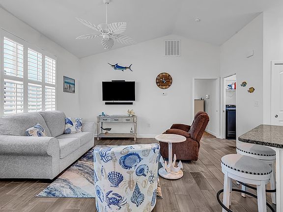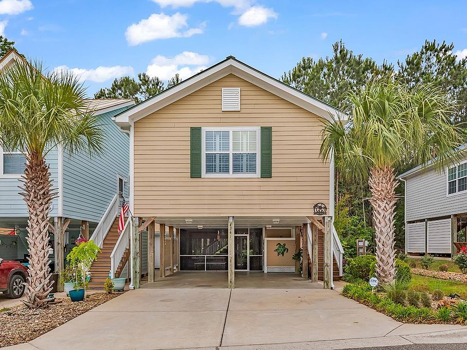 This pristine, move-in ready home is immaculately maintained and thoughtfully upgraded throughout. Built in 2017 and nestled in a sought-after natural gas community, it combines elegant design, modern comfort, and the perfect space for indoor and outdoor entertaining. Inside, the wonderfully open floor plan is accentuated by soaring vaulted ceilings and natural lighting. Sleek pocket doors enhance flow and function. Large windows are dressed in classic plantation shutters, adding both style and privacy. Wood style tile flooring runs throughout the living, kitchen and dining areas. The kitchen offers fully trimmed raised panel white cabinetry complete with granite countertops, recessed lighting, a spacious island and breakfast bar, stainless steel appliances and a gas cooktop. Each of the two very generously sized bedrooms could serve as a primary bedroom with one offering back steps down to a huge patio and your own private oasis. Your backyard backs to a lush, wooded area. The screened room beneath the home is an entertainer's dream. Featuring a mounted large screen television, more than ample seating space and dining area and separate room with a built-in wet bar, the screened room is perfect for gatherings or just rinse off in the adjacent enclosed outdoor shower and unwind after a day at the beach. Multiple storage rooms add practicality and convenience to this exceptional home. TVs, bunk beds, exterior storage shed and beverage cooler convey. With fabulous restaurants, shops, golf courses, entertainment, water sports and the beautiful blue Atlantic Ocean and its white sandy beaches just a short drive away, this home offers the ideal blend of comfort, style, and location. Whether looking for a full-time residence or a coastal retreat, this is the perfect spot to call home. Don't miss your chance to own this exceptional property! Come find your place in the sun today! Square footage is approximate and not guaranteed. Buyer is responsible for verification.