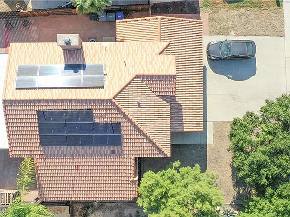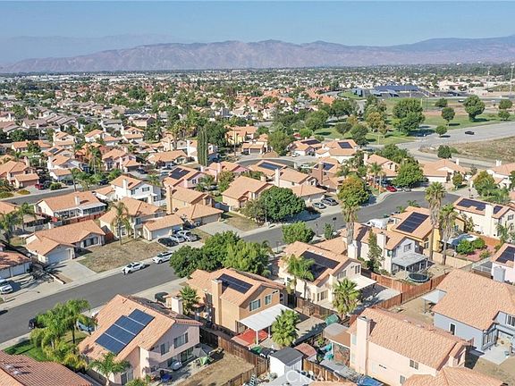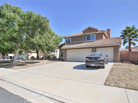 Beautiful two-story home with an expansive three-car garage nestled on a quiet cul-de-sac in the growing city of Hemet. This home has been meticulously enhanced with the addition of extra fully-owned solar panels. Inside, you'll be greeted by the high ceiling that infuses the formal living and formal dining room with abundant natural light. Enjoy the recently updated dual-pane windows throughout the home, along with recently painted bedrooms, enhanced lighting fixtures, touch switches, and stylish ceiling fans. Plush carpeting adorns the upstairs area, while the downstairs boasts an elegant combination of tile and wood vinyl flooring. The kitchen, complete with a convenient pantry, effortlessly flows into the warm and inviting family room, the spacious laundry room includes ample cabinet space for storage. The primary bedroom boasts large closets, double sinks, an invigorating stand-in shower, and a relaxing bathtub. Find your serenity in the low-maintenance backyard, where you can unwind beneath the covered patio. Conveniently located, you'll find shopping, gas stations, and community parks just moments away. This home is a must-see!