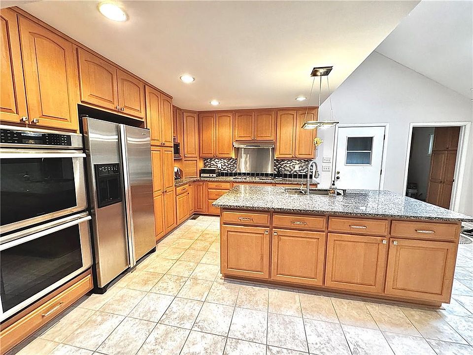 - Features: Breakfast Bar, Cabinets Stain, Eat-in Kitchen, Kitchen Island, Stone Counters, View to Family Room