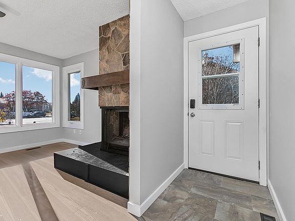 Laminate hardwood flooringTile flooringSteel exterior doorsVinyl windowsProfessional paintOversize windowsStone-faced wood burning fireplace