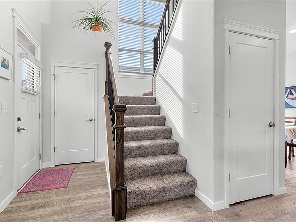 This home is sparkling and bright. Loads of sunshine fill this home, upgraded during and after construction include: tile backsplash, 2-inch faux wood blinds, undercabinet lighting, LVP flooring in main areas and LVP tile in baths, shelving in the garage, and landscaping beyond HOA covenant requirements! Side fenced yard off dining area ideal for pets. The well-appointed kitchen is open to all main floor living space, and with three bedrooms and two baths on the upper level, there's room to spread out. Already professionally cleaned, this home is ready for immediate occupancy. Covenants attached to listing.