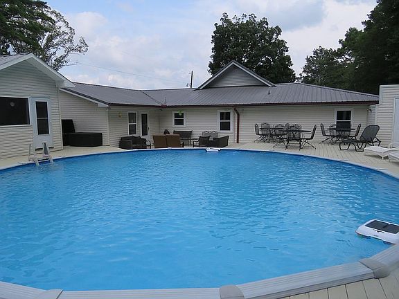 Beautiful home situated on 8.2 acres with a 1,600 SF garage, a 2 BR, 1 BA cottage, and a large deck with a 33' above ground pool with 2 gazebos and a storage room inside the pool enclosure, a storage room next to the landing to the pool from the driveway, a long asphalt driveway from the road to the main house, up to the garage, and ending at the 2 BR, 1 BA cottage sitting at the top of the hill. Storage building, hay shed, and blueberry bushes near the pasture. Front of main house recently updated replacing old windows and cedar trim with new EnergyGuard windows and vinyl cedar shake siding. As of 10/21/2021 the street view is incorrect. The current street view shows the property to the left, not 4343 Crawfords Cove Road. Owners currently interested in selling and downsizing.