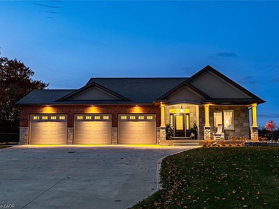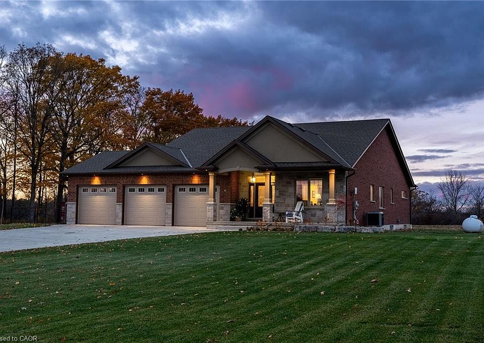 Looking for modern, one level living? Need highway exposure for a home biz? Want a beauty view from a GOLFER'S prime property? Host a 2026 wedding on your sprawling property! 5 year new, custom beauty bungalow by Prominent Homes in 2020, on 1 acre. 3 bedrooms on the main level + a 4th + possible 5th and 6th in the professionally finished basement w/all egress windows. Plenty of flex space in this expansive bungalow. 6” walls throughout. Accessible doorway widths.10’ ceilings on both levels. Convenient main floor laundry. Primary bedroom w/ensuite + main full bath + full bath in basement. Insulated sunroom off the kitchen, perfect for entertaining! Leading to a beautiful poured concrete patio, w/gazebo and hot tub! Professionally installed patio includes combo grass/concrete, fully fenced area to keep your fur babies and little humans safe. Parking for 10+ on the impressive concrete driveway, room for 3 more in the dreamy attached 3 car garage or enjoy the extra storage space! Country living close to town for all your shopping needs. Surrounded by farm fields, nature, and directly across from the 16th hole of Cayuga Golf Club! Convenient Highway 3 access and visibility, be among the first to be plowed out! This property has it all!