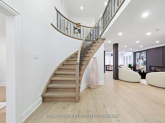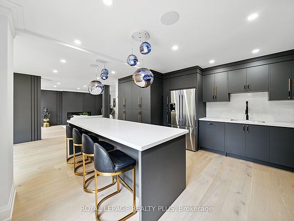 Nestled in a prestigious cul-de-sac, this stunning home boasts a grand entrance, 9.5-inch natural oak floors, an open-concept design, and a chefs dream kitchen with an oversized island. Skylights and floor-to-ceiling windows flood the space with natural light, while a cozy fireplace, custom feature wall, and built-in speakers create a warm and inviting family room with walkout access to a fully fenced backyard featuring mature trees and a patio. The spacious primary suite offers a bay window, open walk-in closet, and a luxurious en-suite with heated floors. All bedrooms are generously sized with custom-built closets. The fully finished lower level includes a wine cellar, an additional bedroom with a walk-in closet or office space, a three-piece en-suite, and potential for a second kitchen or bar. Completing this home is a double car garage, an extended four-car driveway with no sidewalk, and professional landscaping all combining elegance, comfort, and practicality in one remarkable property.