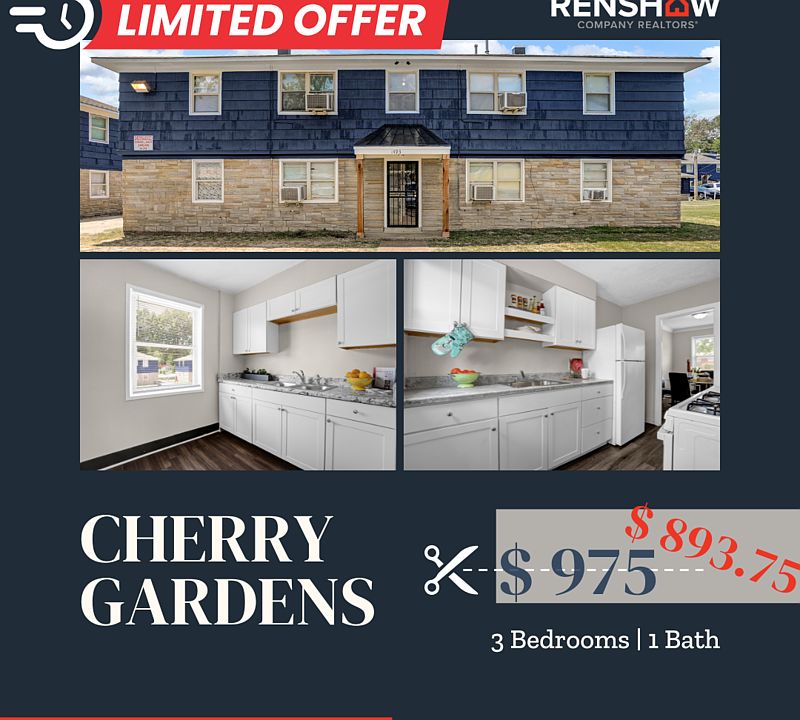 Welcome to the CHERRY GARDENS Apartment Community! These charming 3 bedroom, 1 bath units have been upgraded with new floors, fresh paint, new fixtures and more! Range and fridge are included in the units, as well as community amenities such as BBQ grills, on-site laundry service, and parking! Three bedrooms units are single level and conveniently located throughout the complex. Schedule a self-tour today, and don't miss out on this NEW OFFER for reduced rent! (details below): INCENTIVE: FREE FULL MONTH'S RENT* * Net rent amount of $893.75 reflects contract rent price of $975 minus one free month of rent incentive prorated over the life of the lease. Sorry, NO Pets! Se habla espanol. Qualifications: Must be working 6 months + Combined Income of 3 times rent per household Credit score of 575+ Clean rental history No evictions for 3 years Bankruptcy must be discharged at least one year All Renshaw Company residents are enrolled in the Resident Benefits Package (RBP) for $35/month which includes liability insurance, credit building to help boost the resident's credit score with timely rent payments, up to $1M Identity Theft Protection, HVAC air filter delivery (for applicable properties), our best-in-class resident rewards program, and much more! More details upon application. Renshaw offers potential renters the ability to schedule self showings with ease! Please schedule a showing prior to submitting an application.