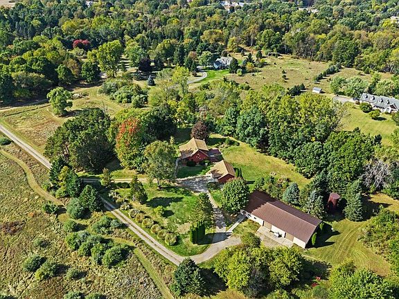 Escape to this picturesque log cabin on 3 rolling acres in Highland Twp — offering that perfect up-north feel without giving up the convenience of nearby shops, restaurants, and access to M-59 and US-23. Nature lovers will appreciate the peaceful setting and the impressive 40x80 insulated pole barn with concrete floors, a half bath, 10 ft ceilings, and new furnace. Inside the home, the warm wood tones, vaulted ceilings with skylights, and stunning stone fireplace create a cozy retreat. The open-concept kitchen features stainless steel appliances and views of the backyard. Two main-floor bedrooms, a full bath, and laundry offer easy living, while upstairs you'll find a mezzanine overlooking the living room, a spacious primary suite with private bath, and an additional flex room. Enjoy the outdoors from the large deck, two-car detached garage, and all the space this property provides — a true nature getaway just minutes from town.