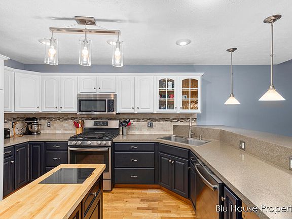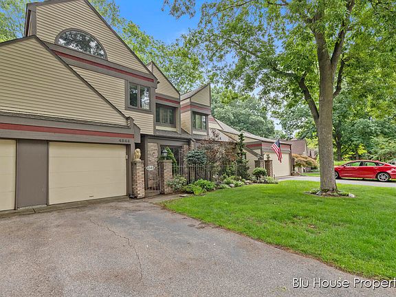 Open house CANCELLED for Sat. 7/8. This contemporary condo in Chateau Ridge offers a serene setting in a convenient location. Buck Creek flows through the backyard with views of the ravine & wildlife. All of this while being right off 44th St. & near 131 ramp. In this 3 bed/3.5 bath condo, every bedroom is an ensuite with a half bath to spare. Notice the woods floors & bountiful counter & cabinet space in the kitchen. Main floor ensuite is off the kitchen. Living room, dining area & balcony access round out the main floor. Fabulous primary ensuite on the upper level with a large bedroom with vaulted ceilings, walk-in closet, & a large loft area currently being used as an office. Downstairs is another living space with a wet bar, fireplace & walkout to patio.