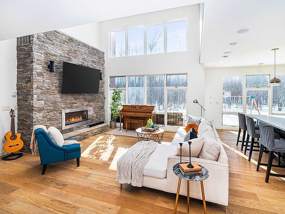 - Description: Open to all areas with stone surround fireplace and floor to ceiling windows.