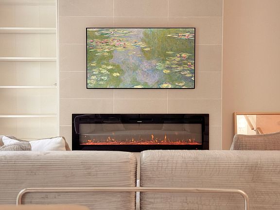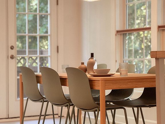 The home is offered fully furnished: A master suite with a queen-sized memory foam bed and three guest bedrooms with full-sized memory foam beds. Communal areas are curated with designer-inspired pieces, including a mid-century modern coffee table, vintage corduroy lounge chair, modular memory foam sleeper sofa, extendable white oak dining table for six, and a communal writer's desk/home office nook overlooking a 55" Samsung "The Frame" TV. Abundant wall shelving for decorations to help make the space feel more like home and credenzas provide additional storage.