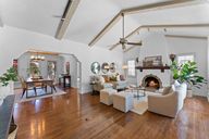 Grand fireplaceVibrant bougainvilleaSerene gated front courtyardOriginal hardwood floorsLush landscapingOpen shelvingBeautiful center island