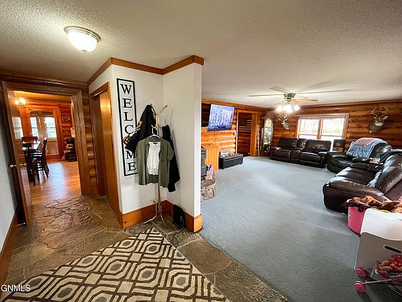 In addition to the log home, you'll find an oversized shop/garage with double doors that also provides attached apartment/living quarters.