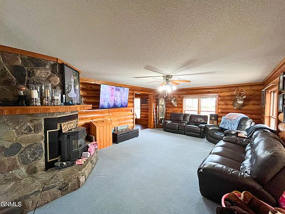 Nestled among large trees, you'll find a beautiful log home that emits rustic charm. As you approach the front porch, you can reminisce days gone as you pass by the dinner bell that was sure to have called many to the table. Guests are welcome to enjoy the large covered porch where one can sit a spell to visit or relax at the end of the day. Inside, you're greeted with a large entry as you begin your journey throughout the home. Off to the left is a bedroom and stairs that lead to the upper level, where you'll find two bedrooms, a full bathroom, and the primary bedroom and bathroom. To the right of the main entry is the formal living area with a beautiful stone fireplace. Adjacent is the formal dining room that leads you to the heart of every home, 'the kitchen,' and this is spectacular! Beautiful wood cabinets provide generous storage space for all your pots, pans, baking supplies, and dishes. Stunning stainless steel appliances include a gas cooktop, double oven, and farmhouse sink, with the microwave built into the island. Sparkling polished concrete countertops compliment the entire kitchen, are easy to maintain, and make kitchen clean-up a breeze. An eat-in dining area is adjacent to the kitchen with sliding glass doors that lead to the back screened-in porch, the detached garage, and the back of the home. The main hallway leads you to the 3/4 bathroom and laundry room. At the end of the hallway, you'll stand in awe of the massive family room, with a big beautiful stone fireplace, exposed beams and cathedral ceilings, with French doors on each side of the room that lead to the front or back of the home. This room is the perfect place to showcase your trophies! The second set of stairs leads to another bedroom, a 3/4 bathroom, and a spacious loft area (above the attached garage) that has large windows and French doors on each side, allowing natural light into this space. The loft is equipped with a hot tub and sauna. Beneath the loft is a 3/4 bathroom and a large room that is currently used as an office. Completing the tour of this home is the oversized double-car garage.