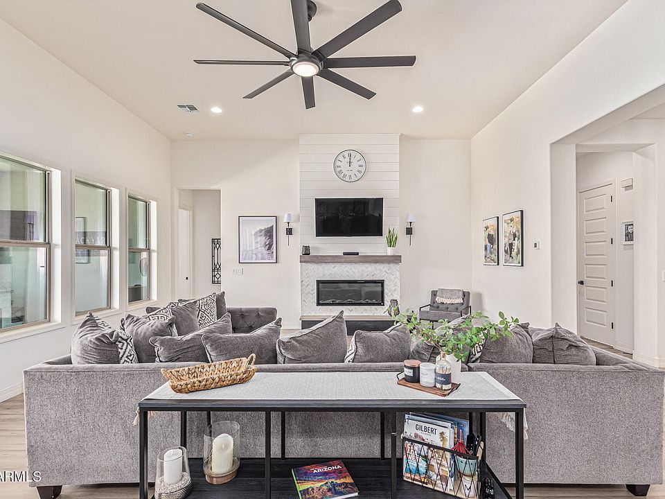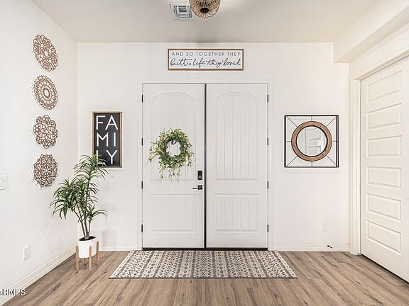Welcome to this exceptional single-level home offering 3,080 square feet of thoughtfully designed living space. With 3 bedrooms, 3.5 baths, a den, and a versatile flex room, it's perfectly suited for families or hosting guests. The bright, open interior showcases upgraded flooring throughout and timeless design details. The gourmet kitchen features quartz countertops, a huge pantry, mudroom, and a spacious dining area, all flowing seamlessly into the open-concept living spaces; ideal for everyday living and entertaining alike. The luxurious primary suite includes a spacious bathroom with dual vanities, a walk-in shower, private toilet room, and a large walk-in closet. Step outside to your own private retreat: a perfectly sized pool, custom built-in grill station, and a large covered patio designed for both relaxation and entertaining. The backyard is low-maintenance and offers exceptional privacy. Nestled in Eastmark, one of the area's premier communities, this home provides access to parks, scenic walking trails, and top-rated schools, all within a vibrant and welcoming neighborhood.