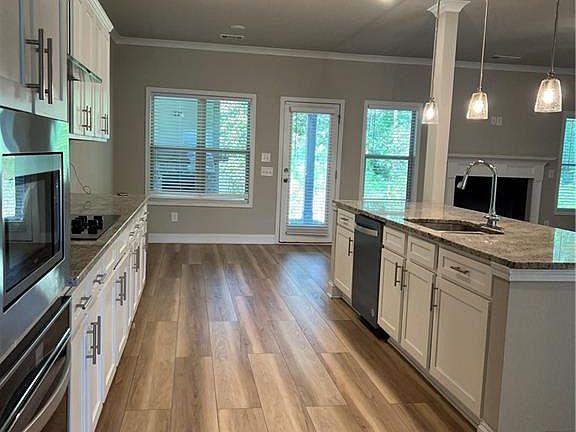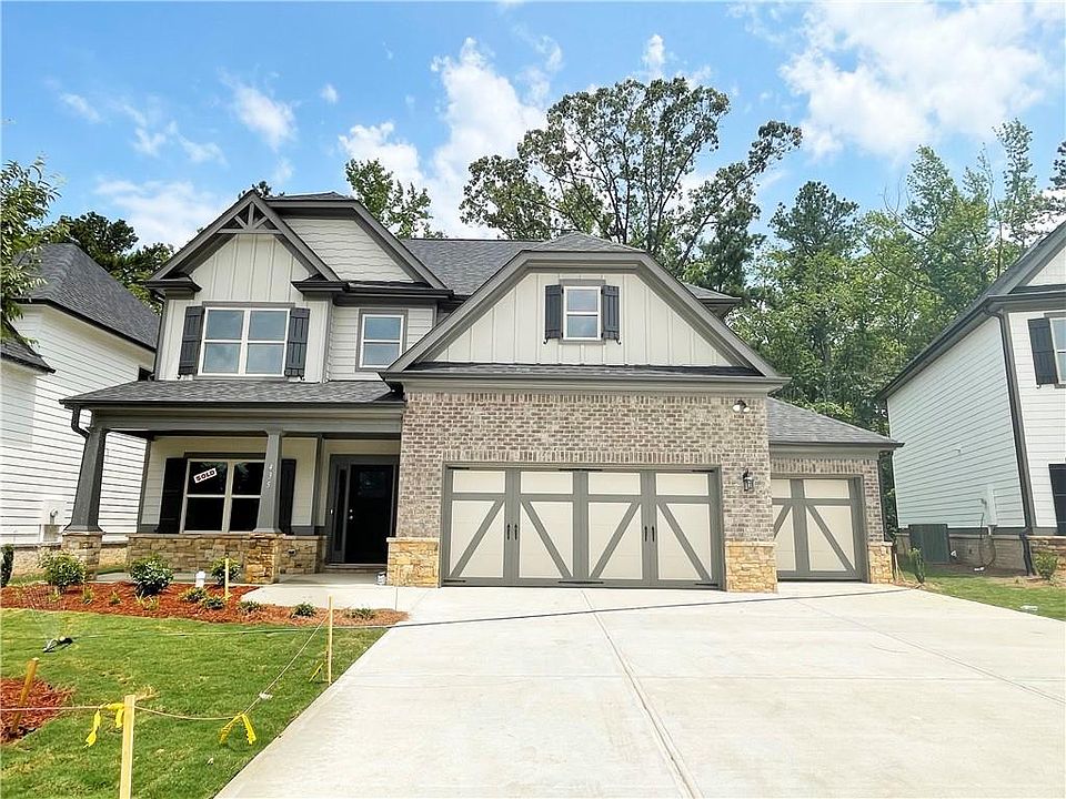 A beautiful craftsman-style home with a 4-sided stone & brick water table in Dove Lake, Grayson, GA, is available for rent. This 5 Beds + 4 Baths + 3 car garages 2 story house features a gourmet kitchen with a large granite kitchen island, 42" white cabinets, tile backsplash, and stainless steel appliances. The bright kitchen is open to the breakfast area, family room, and dining room with a coffered ceiling. The master bedroom has a large closet and a private sitting room. The master bath has a tile floor, a separate tub with tiles surround, and a tile shower with a tile sitting area. Tiles throughout all the bathrooms. Upgraded hardwood-like floor on the main. Partially covered back patio with a wood-burning fireplace. Flat lot in a great neighborhood with a spacious green space in front. Shopping and easy commute to award-winning Gwinnett County Parks.