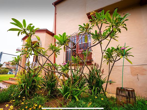 The property is surrounded by mature citrus, fig, and avocado trees, creating a peaceful, garden-like setting.