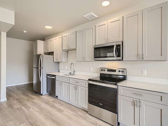 Shaker-style cabinetryModern interior finish palettePrivate detached storage unitQuartz countertopsUndermount sinksBeautiful luxury vinyl flooringFull-size washer and dryer